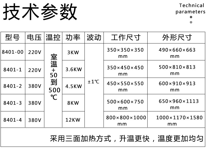 臺式 | 8401-0 | 350×350×350 | 室溫+5℃-500℃ | 220v | 2800W |